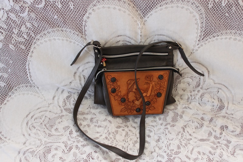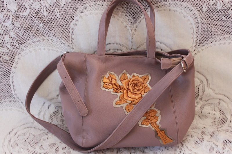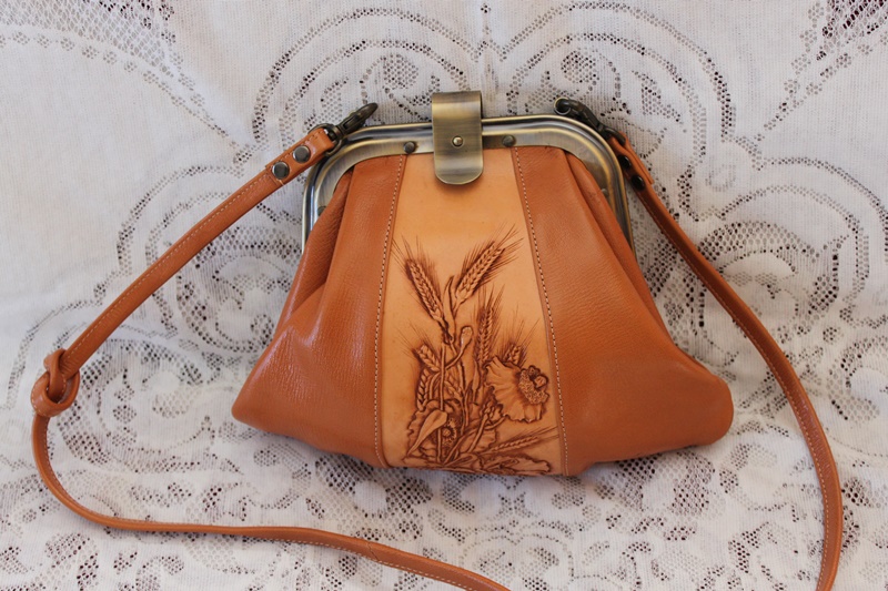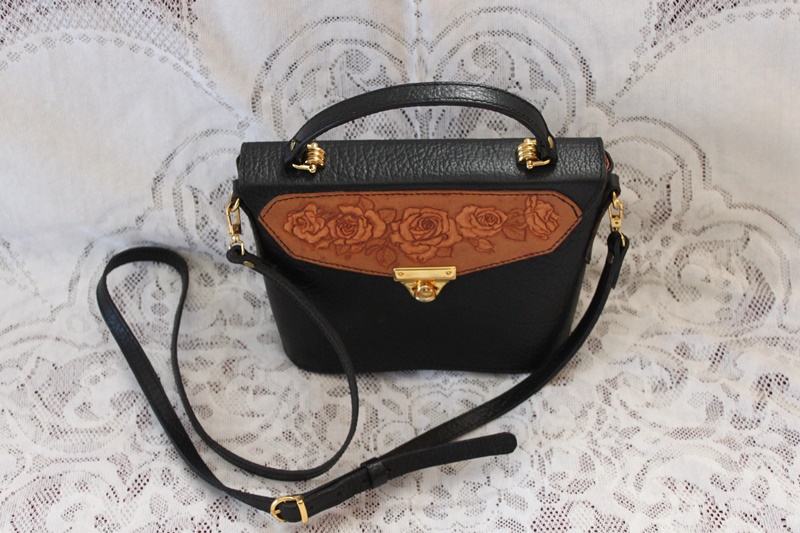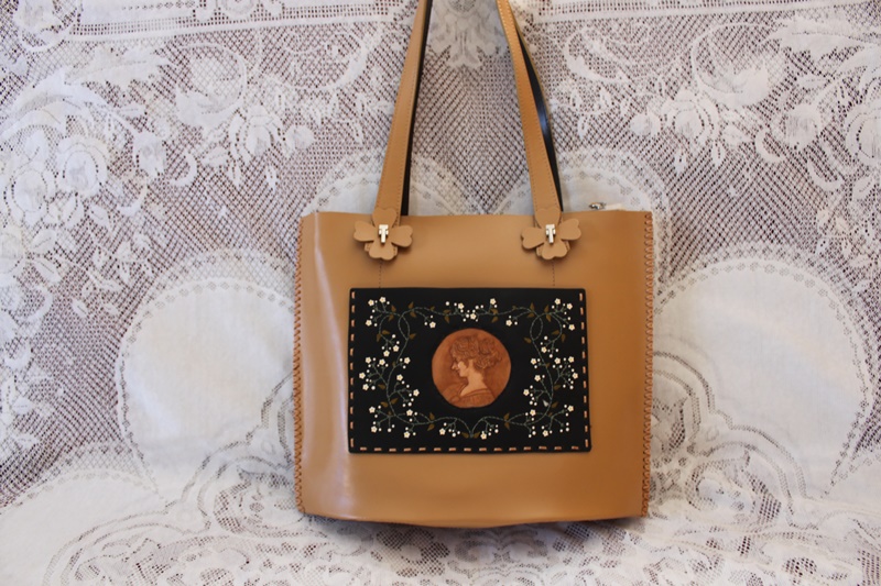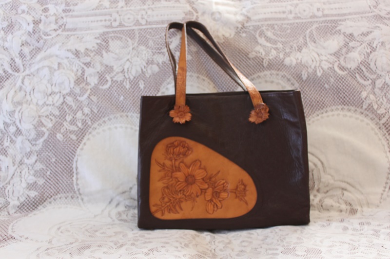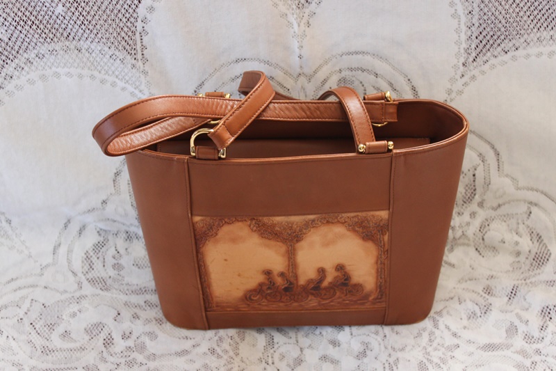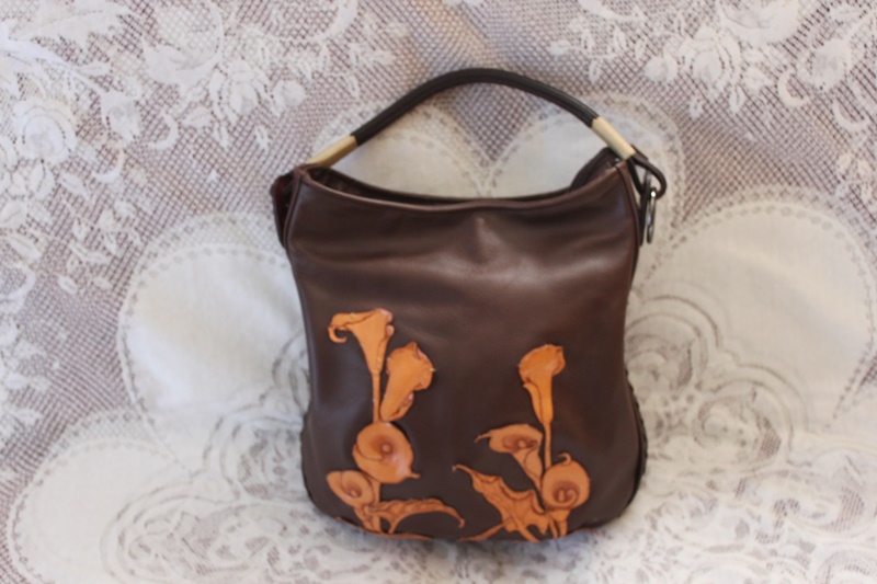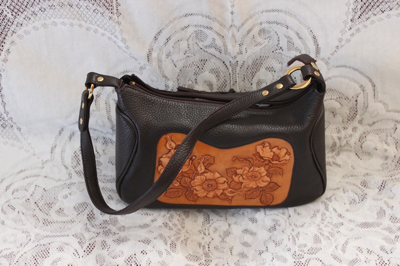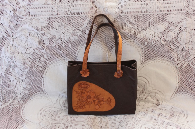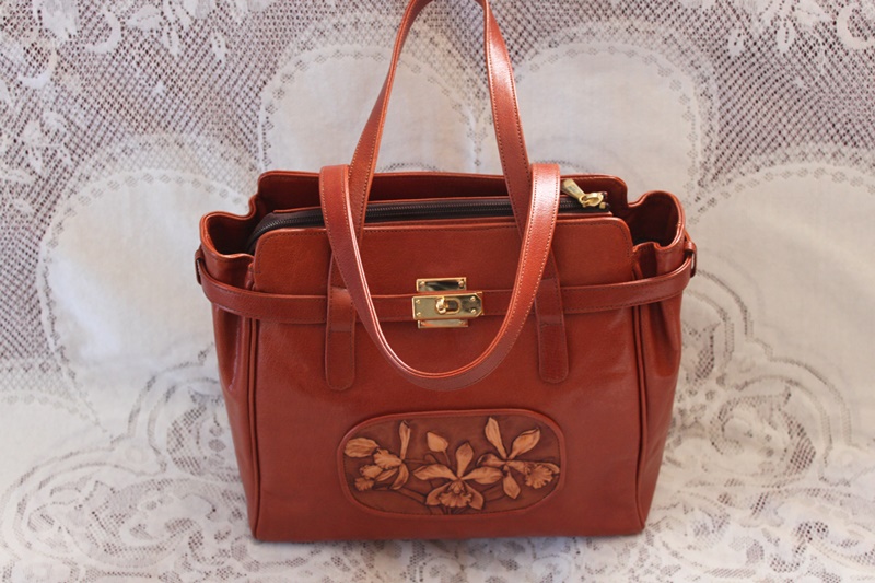 茶色の皮革素材でバッグの中央分に花柄模様のデザインを施して作成されている。