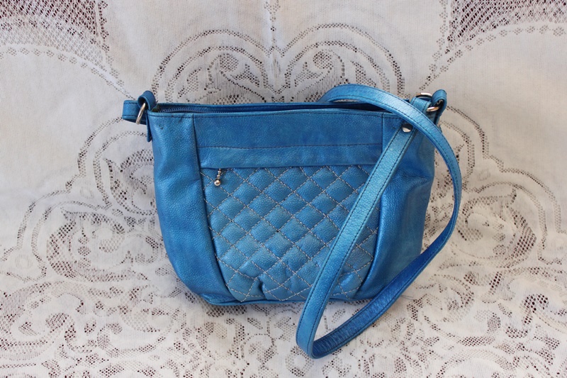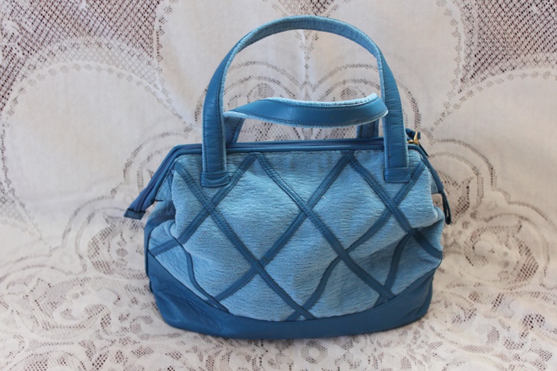 ブルーの皮革素材でシンプルな模様を施した手提げバッグにしてある。