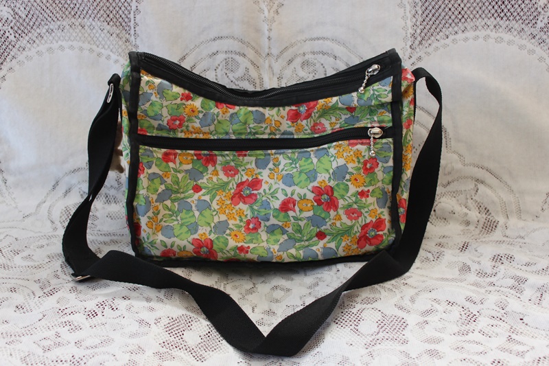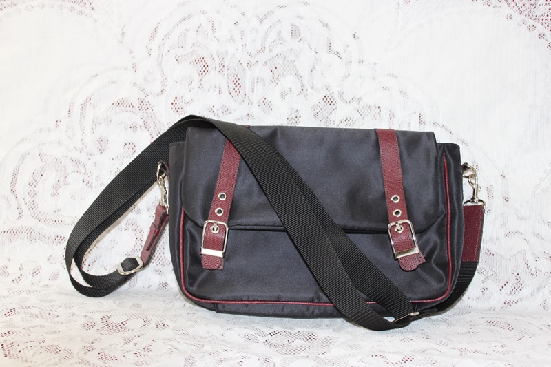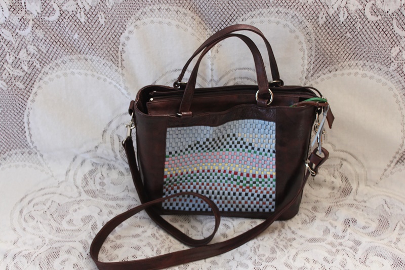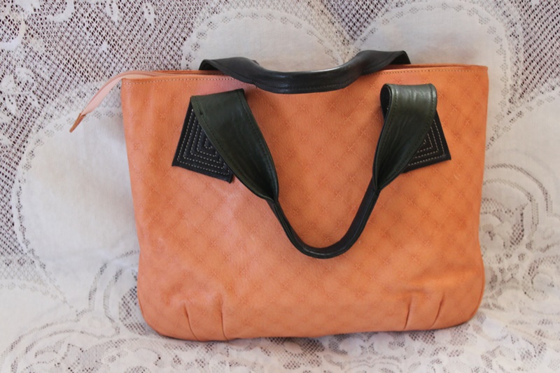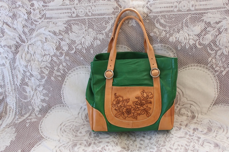 グリーン色の革と布のコントラストで作成したショルダーバッグ。