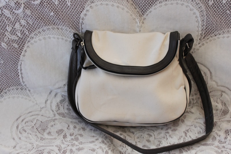 白の布地で皮革素材で縁取りしたコンパクトな仕上がり。