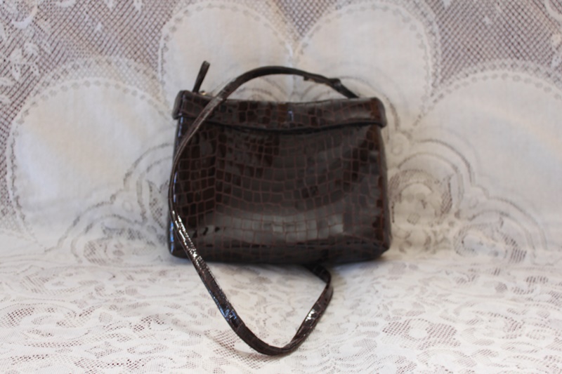 固い茶色の革素材で横長ボックス調にやや大きめに仕上げっている。