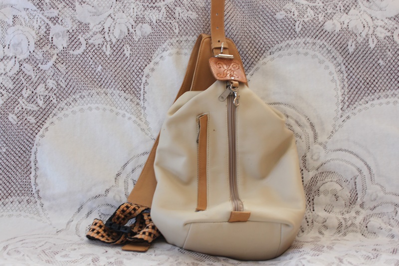 白色の柔らかい革素材でリックサック調に仕上げっている。