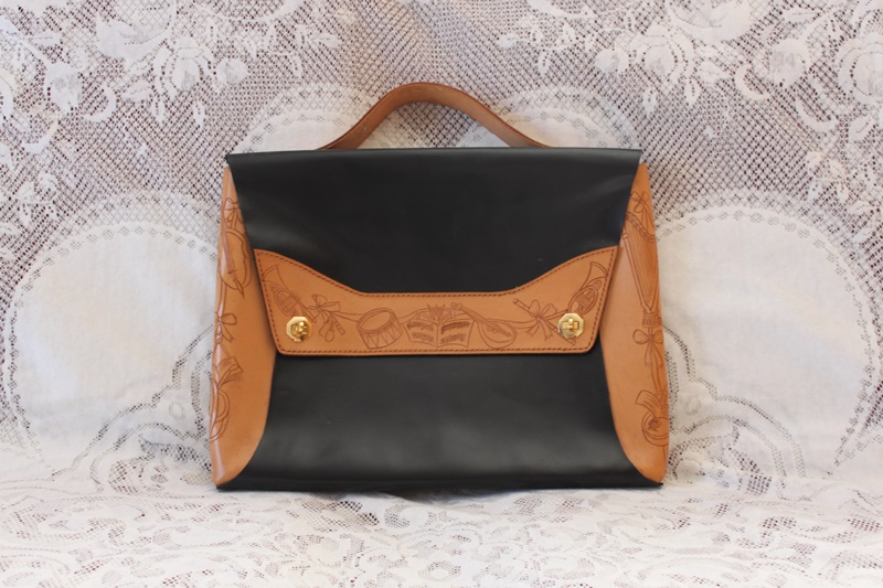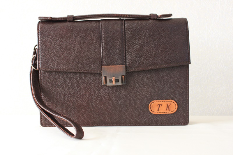 固い茶色と黒色の革素材で書類入れ的デザインに仕上げっている。