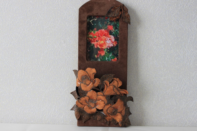 茶色の柔らかい皮革素材で下部に花のデザインを施した縦長おしゃれ調に仕上げっている