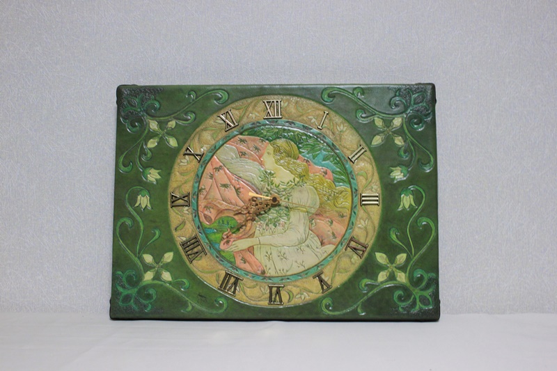 時計版を革製素材で作成しマリア像的デザインを施した。